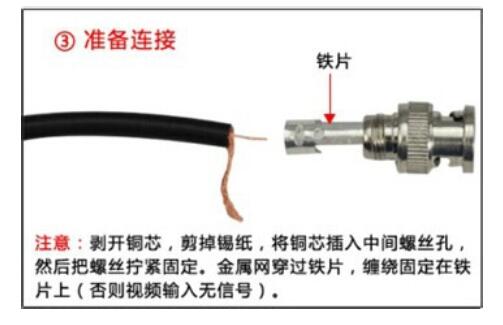 剝開視頻線,將錫紙剪掉,同時將銅芯上的絕緣層剪除,留出合適的銅芯線,屏蔽層的金屬擰成另一條線;把Q9接頭的套筒擰下來,用螺絲松開接頭上的螺絲,將套筒套到視頻線上,視頻線同心軸插到接頭的同心孔,螺絲擰緊,并且將金屬網絲穿過鐵片固定到接頭鐵片上,將鐵片包在視頻線上用鉗子夾緊,擰上套筒就完成接頭安裝了,如下圖: