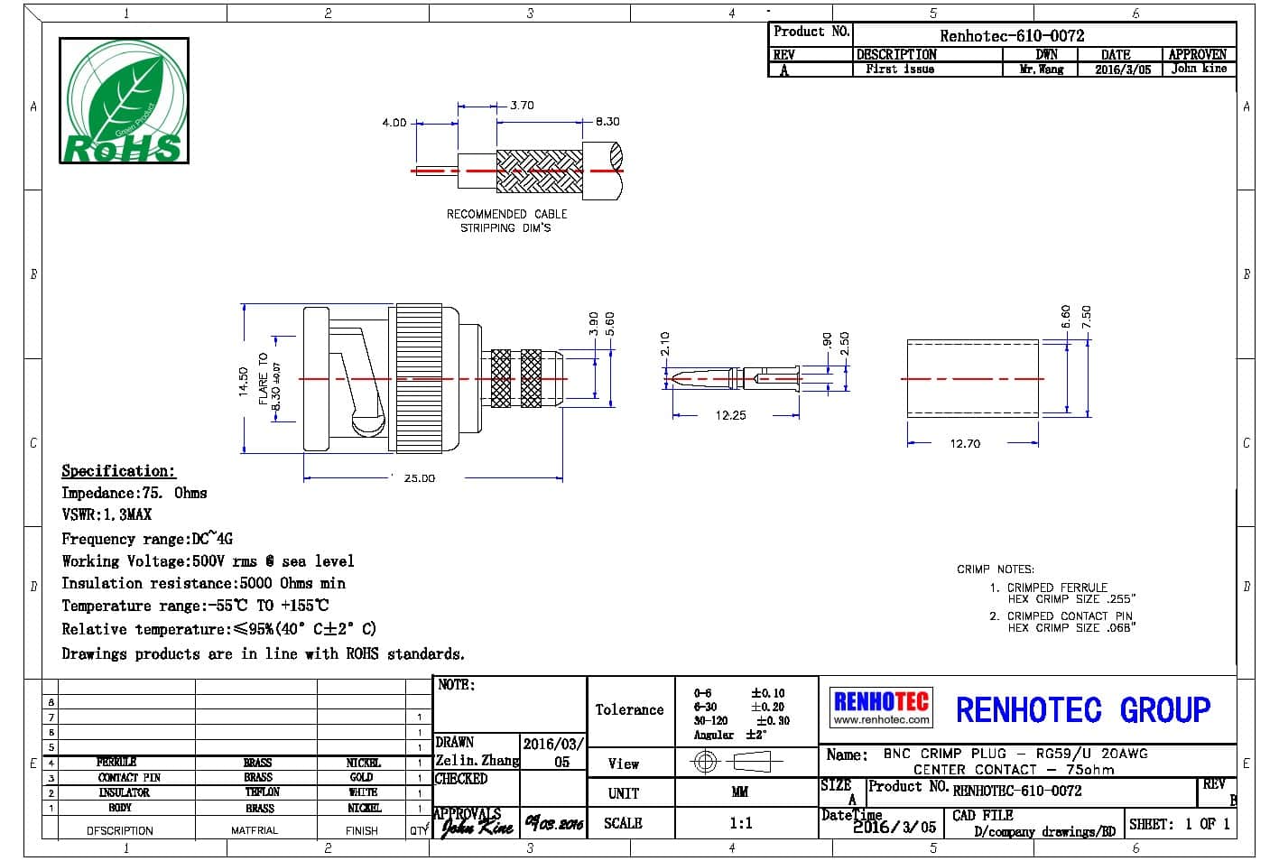 bnc公頭連接器,壓接式 – 50歐姆和75歐姆 直式射頻同軸