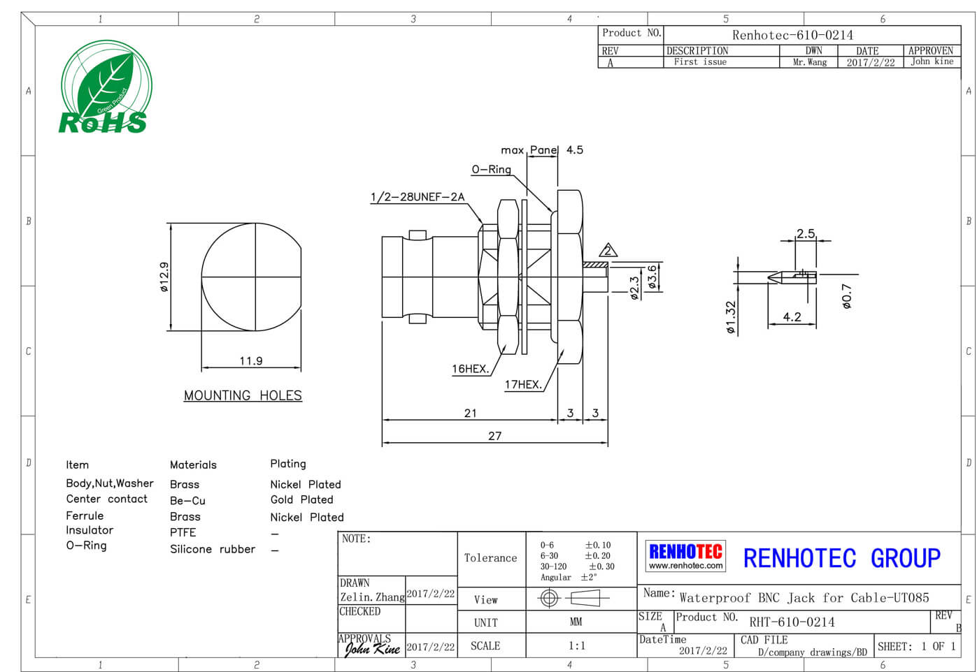 標簽:防水直式鋅合金射頻同軸線纜BNC連接器