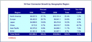 由以上統計可見,再生能源連接器的增長勢頭最近一兩年有些減緩. 取決于全球各國政府在未來可見的幾年的政策, 決策,未來中短期再生能源連接器的增長可能會保持較高的增速. 預測5年后(2016年)再生能源連接器的市場是4.14億美元,每年預增8.3%.