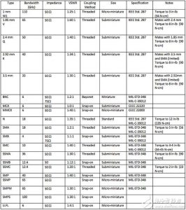 雖然射頻連接器種類眾多,但它們的許多關鍵參數不同。這些規(guī)格包括物理尺寸、阻抗、電壓駐波比、接合類型、帶寬或頻率范圍(表 1)。
