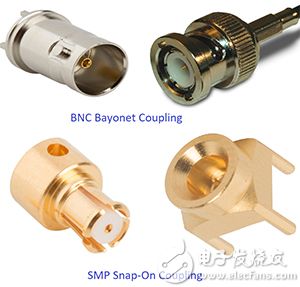 上表中的“接合方法”列顯示了采用的機械鎖定機制的類型。在連接器可能受到振動的應用中,這一點極其重要。接合通常要在易連接性和安全鎖定之間作權衡。圖 1 中顯示的 SMA 連接器對是螺紋接合的一個示例。圖 2 顯示了卡口式和咬接式接合的示例,分別使用 BNC 和 SMP 連接器類型。